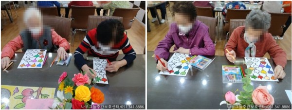 알록달록한 나뭇잎들을 가위로 자르고, 둥근 접시의 테두리에 하나씩 붙여가며 아름다운 리스를 완성하였고, 가운데에는 어르신들의 예쁘고 멋진 사진을 넣어 더욱 특별한 작품으로 꾸며보았습니다.