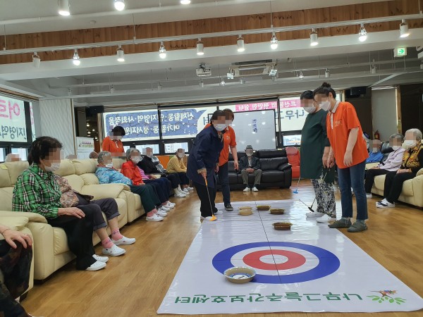 어르신들에게 맞게 변형해서 나무그늘식 컬링을 진행하였습니다.