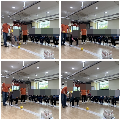 10개의 볼링핀을 맞추기 위해 어르신들께서 집중력을 높여 공을 굴리는 게임입니다. 공을 정확한 곳에 맞추기 위한 신체의