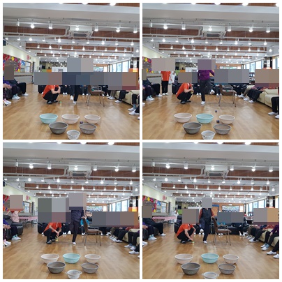 발을 힘껏 차서 바닥에 놓여 있는 숫자판 바구니에 넣어보는 활동으로 각 바구니에 적힌 숫자를 점수로 하여