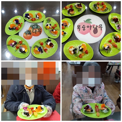 예쁜 식용꽃으로 장식하여 완성해주는 수업입니다. 남은 과일들은 나무 꼬치에 맛깔스럽게 꽂아 과일꽂이까지 완성하였습니다.