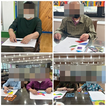 오늘 프로그램은 워크북에 프린트 되어진 그림위에 칠교를 놓아 보았습습니다. 우리 어르신들은 조금은
