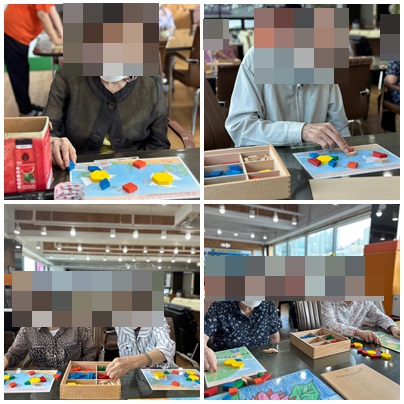 노래를 부르며 수업을 시작하였습니다. 처음에는 조금 어려워 하셨지만 선생님의 설명을 잘 듣고 주의 어르신들과 상의도 하며 열심히 블록 만들기에 집중하셨습니다.