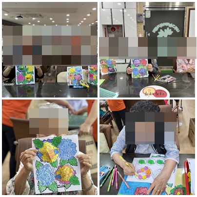 과정에서 어르신들의 소근육 발달, 손과 머리의 협응력에 도움이 되며 원하시는 색을 고르는 과정과 느낌에 맞게 수국을 붙이고