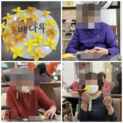 창의력과 상상력을 향상시키고 가위의 사용과 개나리를 붙이는 과정에서 어르신