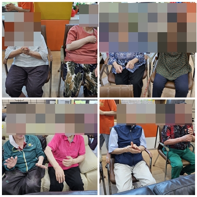 함께 흘러간 트로트를 부르며 뇌자극 시간을 가져보았습니다. 어르신들은 빠르게 진행되는 손유희에 헷갈려하셨지만 그모습 마져 재미있으신지