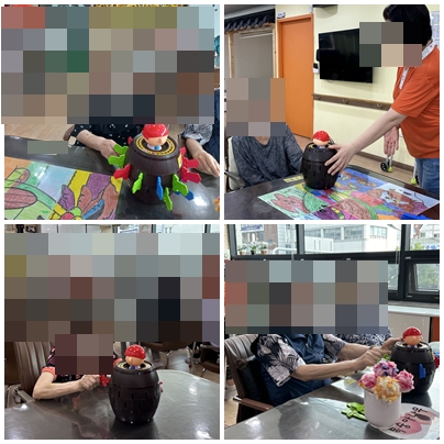 해적이 튀어나오지 않은 어르신들은 휴~ 하며 안도의 숨을 쉬기도 하시며 다음어르신에게 턴을 넘겼습니다. 그러다 한순간 해적이 튀어나오면 깜짝 놀라하시며