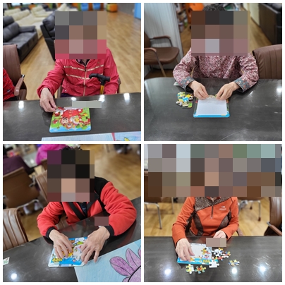 조각을 집중해서 하나하나 잘 맞춰 주셨습니다. 처음에는 어떤 조각을 어디에 놓아야 할지 몰라 하시던 어르신들도 모서리부터