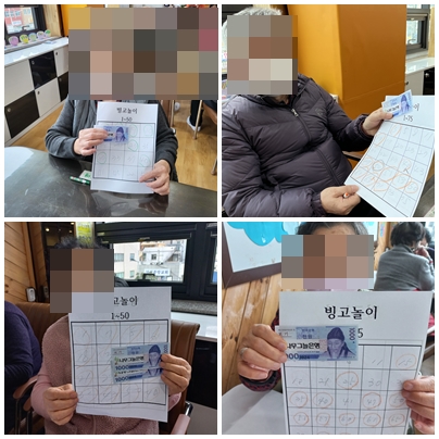 작성하시는 과정에서 기억력향상과 수 인지기능에 도움이 되며 사회자가 불러주는 숫자를 귀 기울여