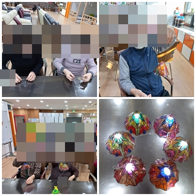 접은 후 매직으로 알록달록 예쁘게 색칠하고 붙여 등갓을 완성하고 조명까지 넣어 완성시켜주는 프로그램입니다. 이 수업은 어르신들이