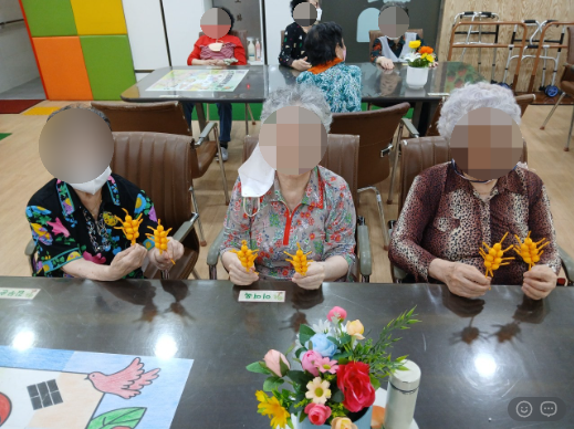 어르신들께서는 노끈을 알맞게 펼친 뒤, 그 안에 우드락 볼을 넣고 위쪽은 길게, 아래쪽은 짧게 감싸 꼬아 황금 빛 벼 이삭 모양을 만들어 보셨습니다.