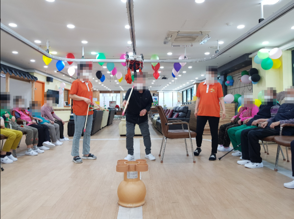 투호는 4개의 크고 작은 구멍이 있는 병에 화살을 던져 많이 꽂아 넣는 활동으로 가운데 커다란 구멍은 3점, 옆에 4개의 작은 구멍은 1점으로 점수를 부여하여 진행했습니다.
