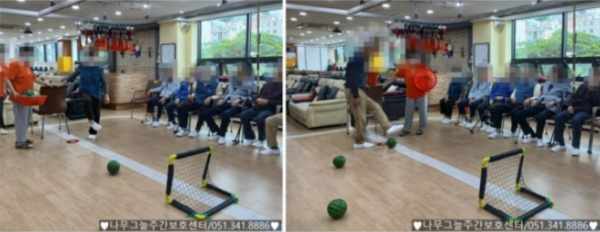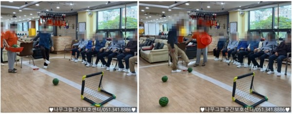 가벼운 수박 공을 이용해 어르신들과 함께 축구 시간을 가져보았습니다
