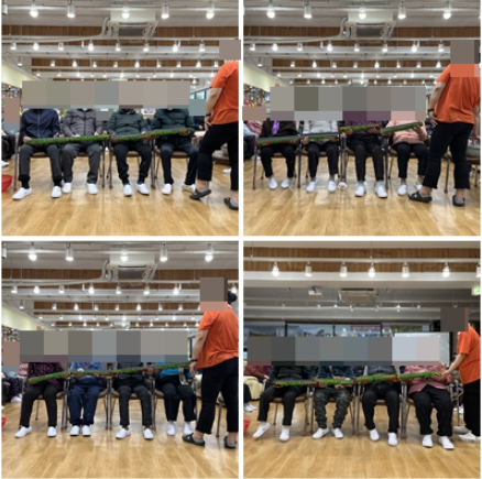 오늘 소개해드릴 신체활동 프로그램은 “방울공 협동게임”입니다. 이 게임은 원통을 반으로 자른 모양의 게임 판을 어르신들에게 하나씩 나눠드립니다.