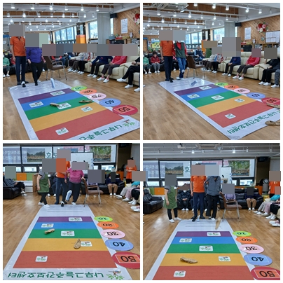 어르신들과 함께 어릴 적 놀이를 떠올리며 고무신과 짚신 한 켤레를 가지고 점수판 위에 신발 던지는 놀이를 즐겨 보았습니다.