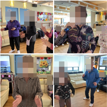 직원들과 춤도 추셨습니다. 노래와 춤은 어르신들의 스트레스 해소와 혈액순환에 도움이 되는 활동입니다. 우리 어르신들은 추억의
