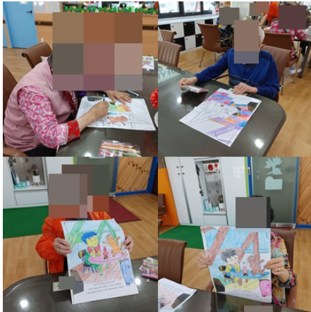 동화책의 한 장면, 한 장면의 도안에서 점선을 따라 그림을 완성해보고 채색해보는 시간이었습니다.