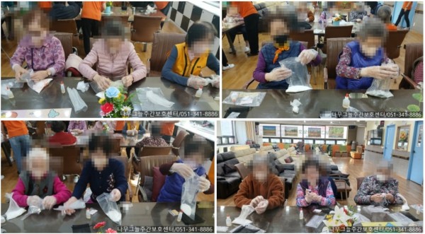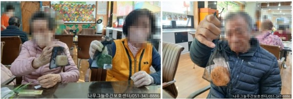 어르신들의 손등에 심신안정에 좋은 아로마 테라피 향을 한 방울씩 떨어뜨려 함께 향을 느껴본 뒤, 천연비누 만들기에 필요한 재료 소개와 안전 수칙을 안내해드렸습니다.