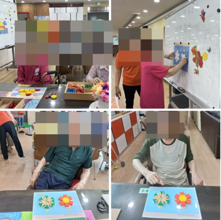 나무 블록을 이용하여 프린트된 워크북의 그림모양에 맞게 블록을 맞춰보는 수업입니다. 여러 가지 방법으로 모양을 만드는 활동을 통해 도형의 특징을