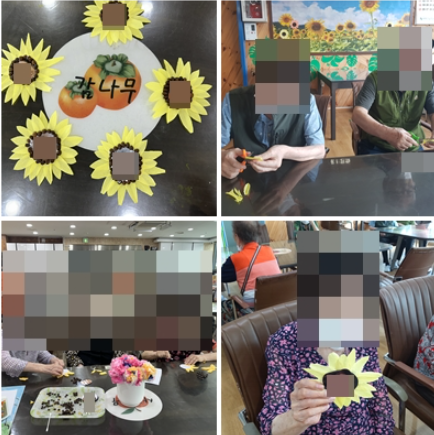 어르신들의 가위질과 풀칠등을 위해 사용하는 소근육발달과 해바라기꽃을 떠올려 봄으로써 인지 향상에 도움이 되는 프로그램입니다.