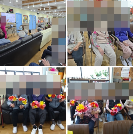 강사님과 함께 최신 트로트에 맞춰 스트레칭도 하고 노래도 함께 배워 보았습니다. 한소절씩 따라 부르니 금방 배워진다 하시며 즐거워 하셨습니다.