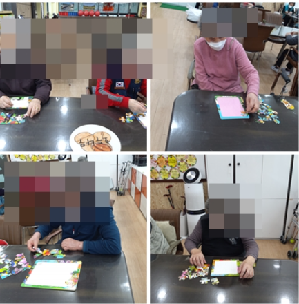 치매예방, 인지능력, 시공간적 지각 능력 향상, 기억력과 집중력 향상 등에 많은 도움이 되는 활동입니다. 각기 다른 모양의 퍼즐 조각을 집중해서 하나하나 잘 맞춰 주셨습니다.