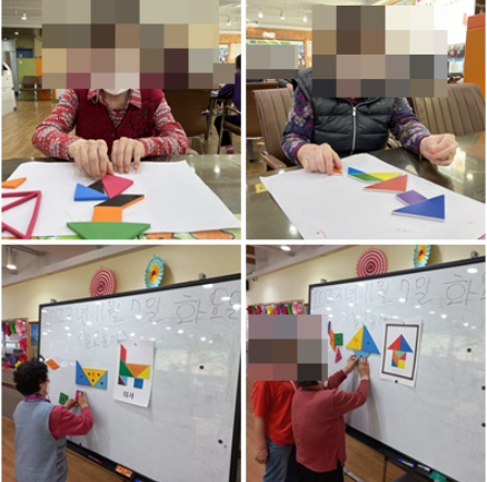 오늘 프로그램은 워크북에 프린트 되어진 그림위에 칠교를 놓아 보았습니다. 우리 어르신들은 조금은