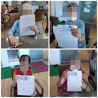 이 프로그램은 어르신들께서 숫자를 빙고종이에 작성하시는 과정에서 기억력향상과 수 인지기능에 도움이 되며 사회자가 불러주는 숫자를 귀 기울여 들어야 하기 때문에 집중력향상에 아주 좋은 프로그램입니다.
