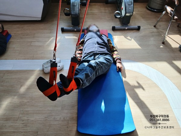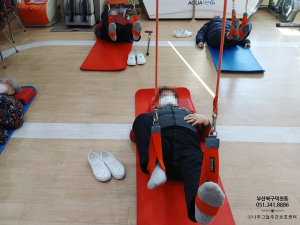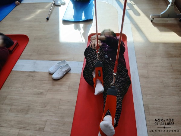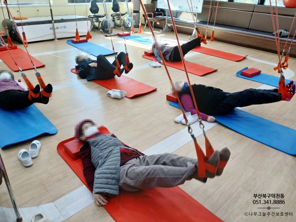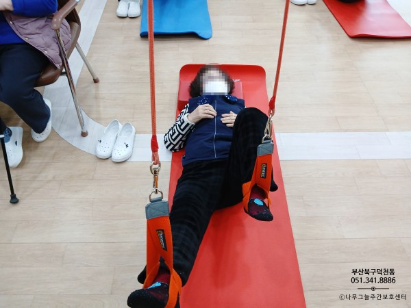 매트에 누워서 슬링기구에 다리를 끼워 넣고 다리를 들어올려보는 운동으로 하체 근력 운동은 물론 코어운동까지 같이 할 수 있는 운동으로 낙상위험이 전혀 없어서 안전하게 진행 되는 신체기능활성 프로그램입니다.